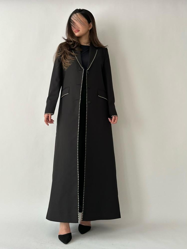 عباية مبطنة suit باللون الاسود بقماش الكوري بخط باللون الاسود والذهبي بطرحة قماش اسود الشيلة الملكية الكوري