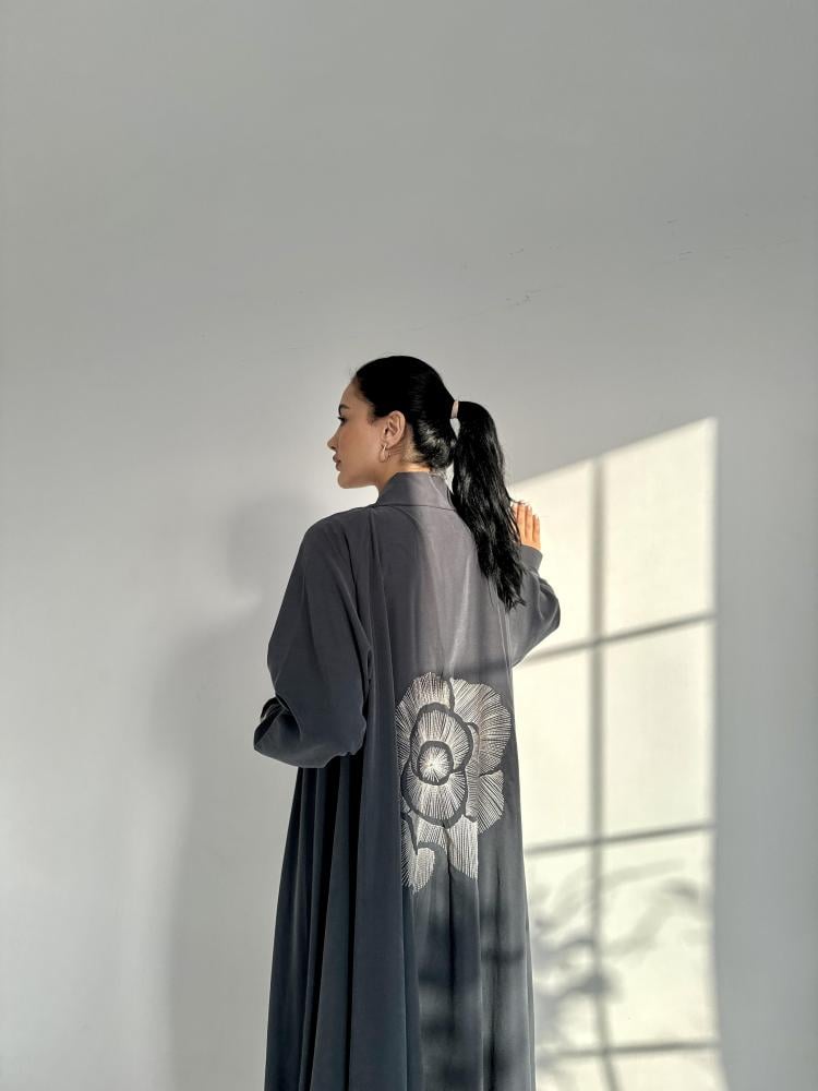 عباية دبل كلوش بقماش اللنين المغسول الكوري بتطريز الوردة باللون الاخضر الغامق وبطرحة قماش الشيفون الكوري مطرزة