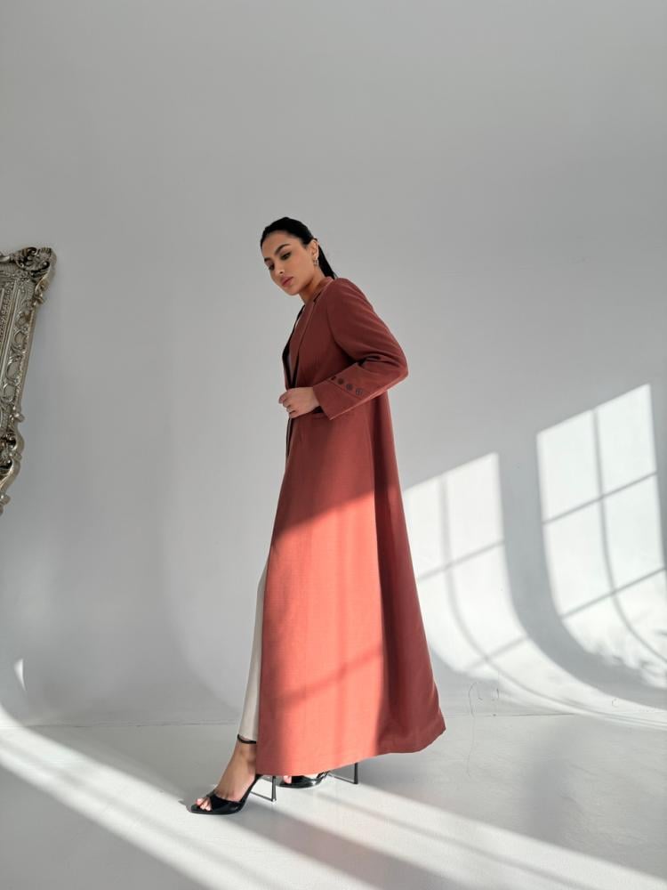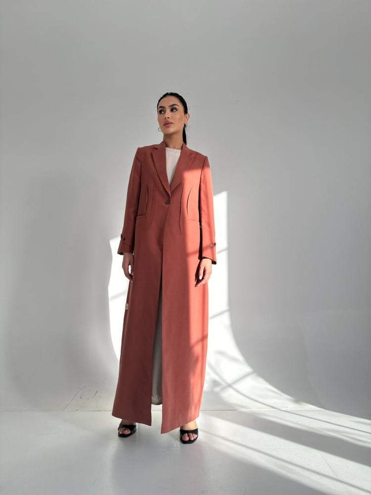 عباية suit بقماش اللنين المغسول الكوري باللون البرتقالي/الورد وطرحة الشيفون الشيلة الملكية