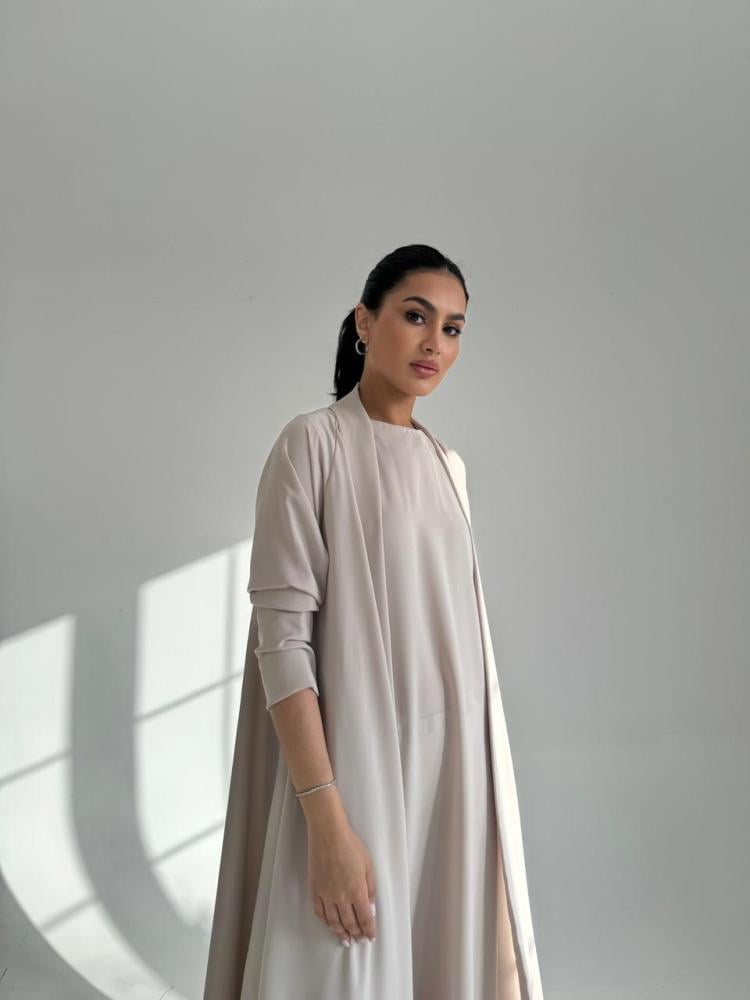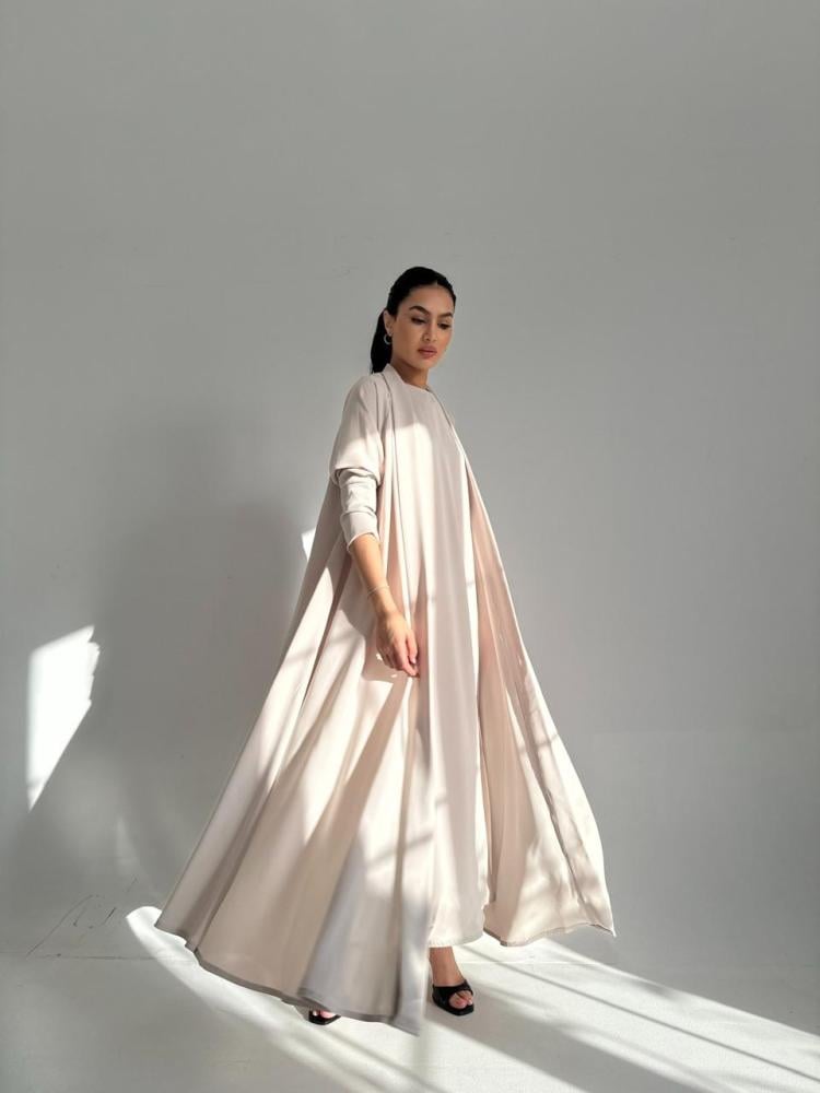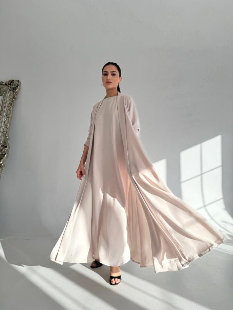 عباية دبل كلوش وفستان بقماش الكريب ياباني باللون البيج وبطرحة قماش الشيفون الكوري باللون البيج