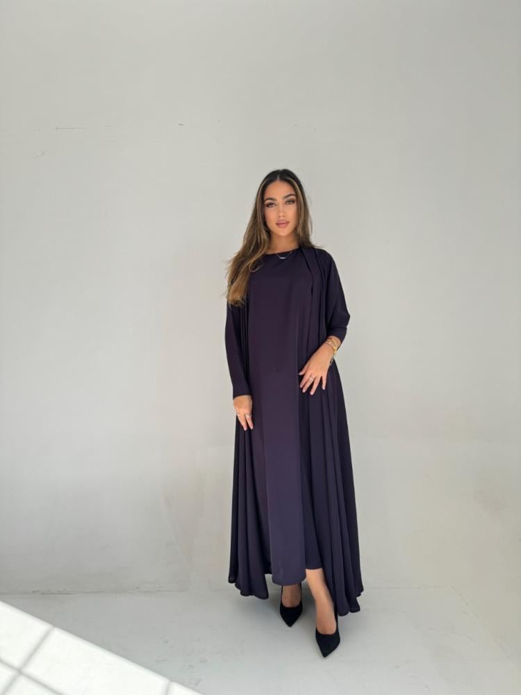 عباية دبل كلوش وفستان بقماش الكريب الياباني باللون البنفسجي الغامق مع طرحه من الشيفون الكوري باللون البنفسجي الغامق