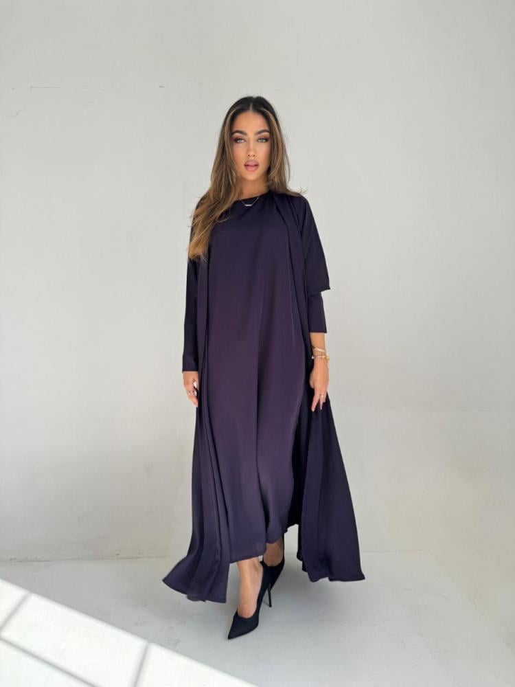 عباية دبل كلوش وفستان بقماش الكريب الياباني باللون البنفسجي الغامق مع طرحه من الشيفون الكوري باللون البنفسجي الغامق