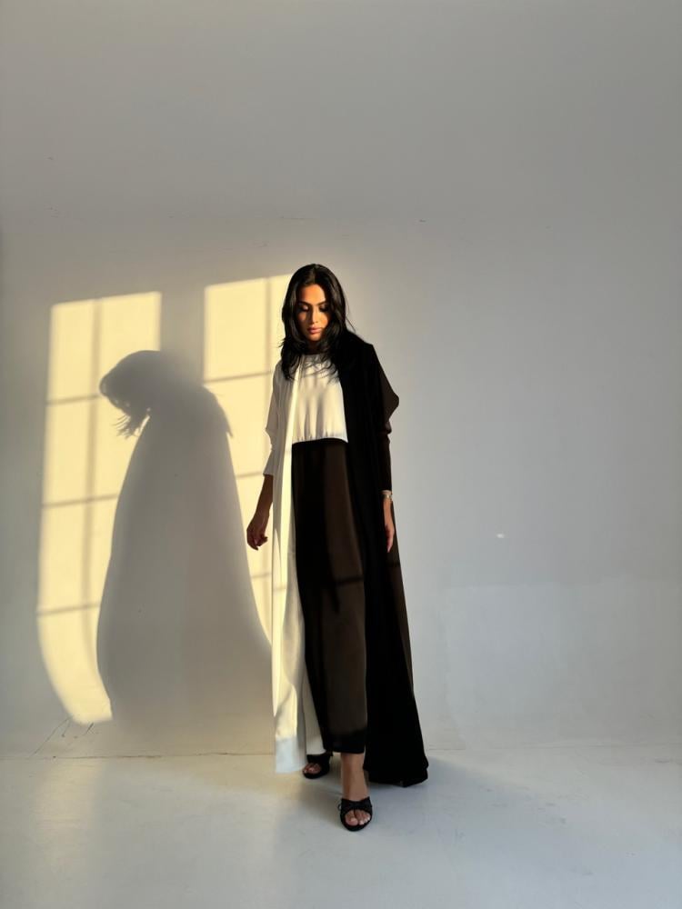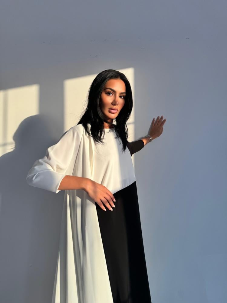عباية دبل كلوش وفستان بقماش الكريب ياباني باللون الأسود والأبيض الاوف وايت وبطرحة قماش الشيفون الكوري اسود