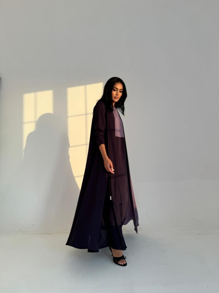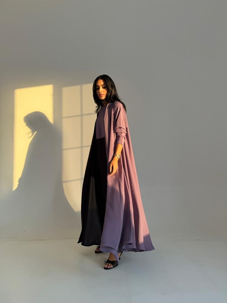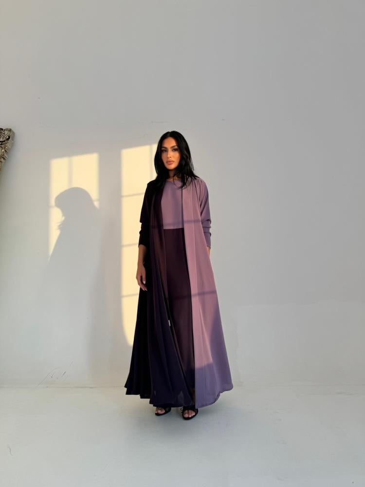 عباية دبل كلوش وفستان بقماش الكريب ياباني باللون البنفسجي الفاتح والبنفسجي الغامق وبطرحةب باللون البنفسجي الفاتح والبنفسجي الغامق قماش الشيفون الكوري