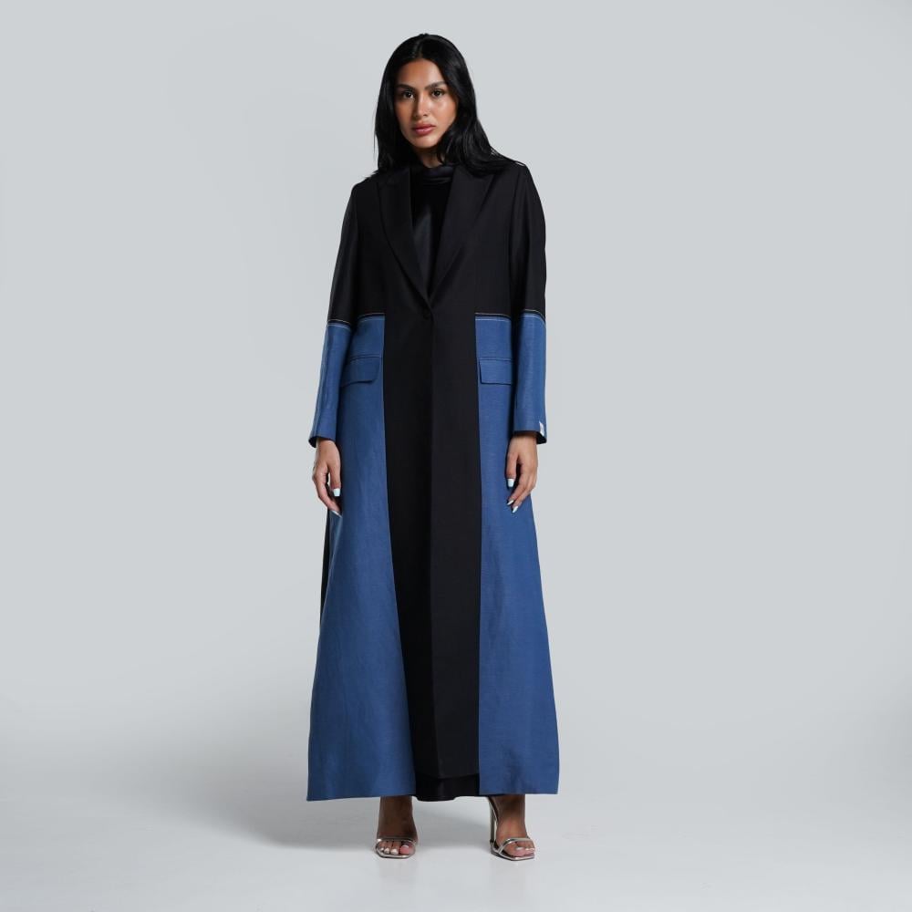 عباية suit مبطنه بقماش الكريب الكوري و اللنين بشكل الجينز الازرق بتطريز خطين مع طرحة بقماش الشيفون الكوري باللون الاسود