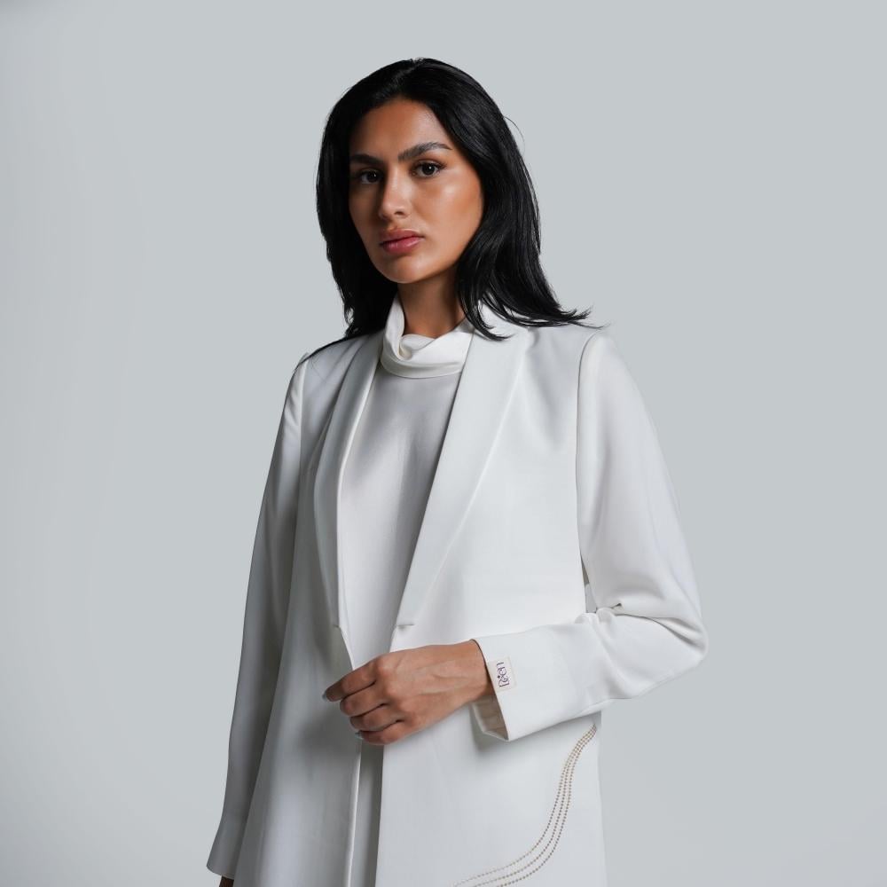 عباية suit مبطنه بقماش الكريب الياباني لون الابيض الهادئ بتطريز الملك فيصل برقصه العرضه من الامام والأكمام وطرحه مطرزة من الطرف بقماش شيفون الكوري الابيض