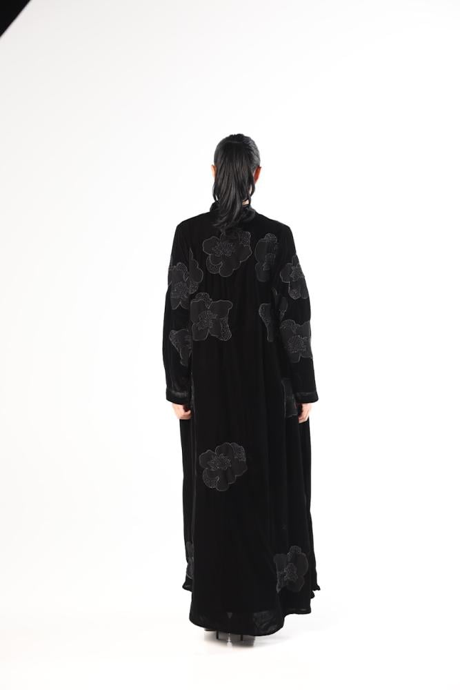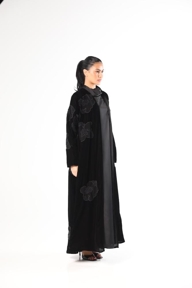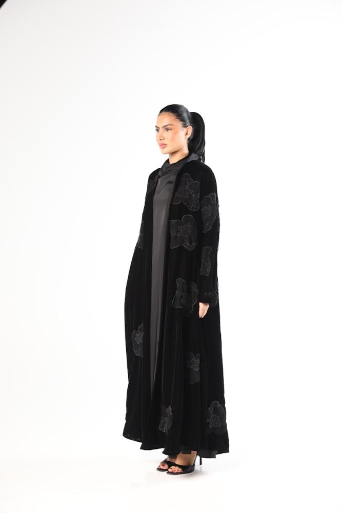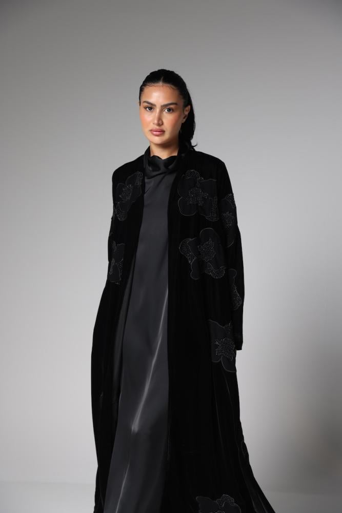 عباية كلوش بقماش المخمل باللون الاسود الكوري مطرزة مع شك باللون الاسود مع طرحة بقماش شيفون مطرزة بالشك باللون الاسود
