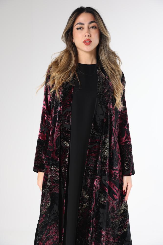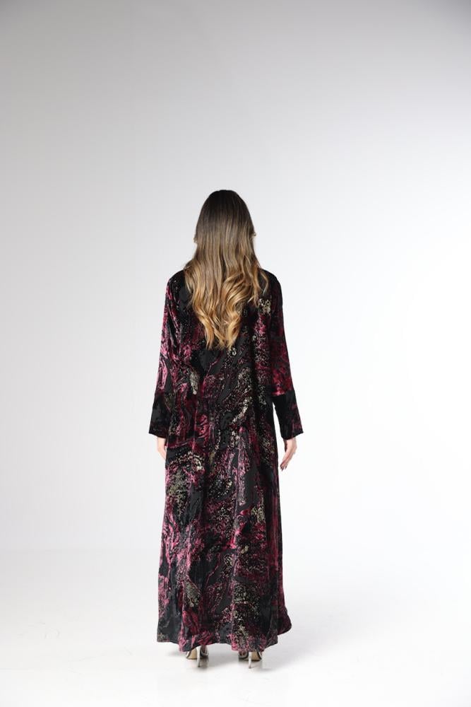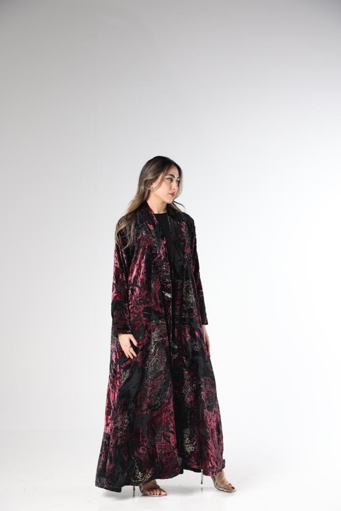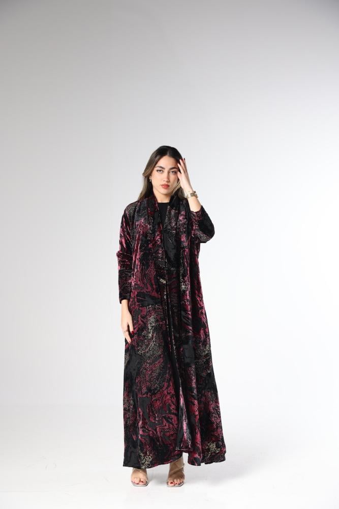 عباية كلوش بقماش المخمل الهندي مموجه باللون العنابي فاتح مائل للوردي والذهبي والاسود مع طرحة شيفون باللون الاسود.