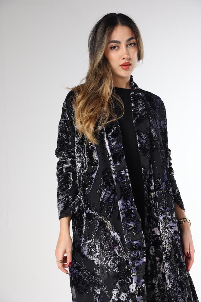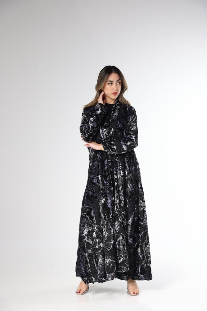 عباية كلوش بقماش المخمل الهندي مموجه باللون الرمادي والذهبي والاسود مع طرحة شيفون باللون الاسود.