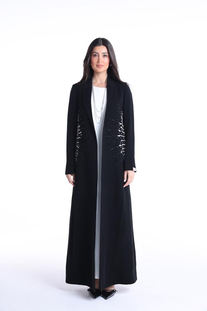 عبايه بقصة الsuit باللون الاسود الفاحم بقماش الكريب الكوري بتصميم شك يدوي من الخصر باللون الاسود الفضي والكريستال مع طرحة بقماش الشيفون الكوري بلون الاسود