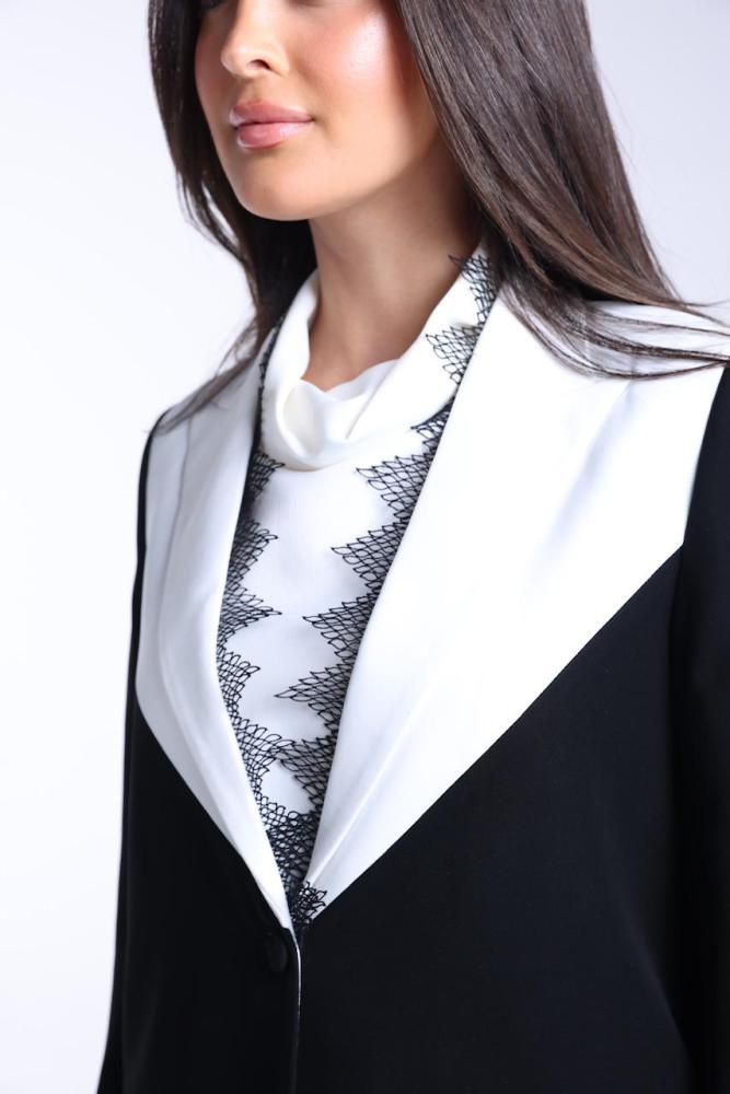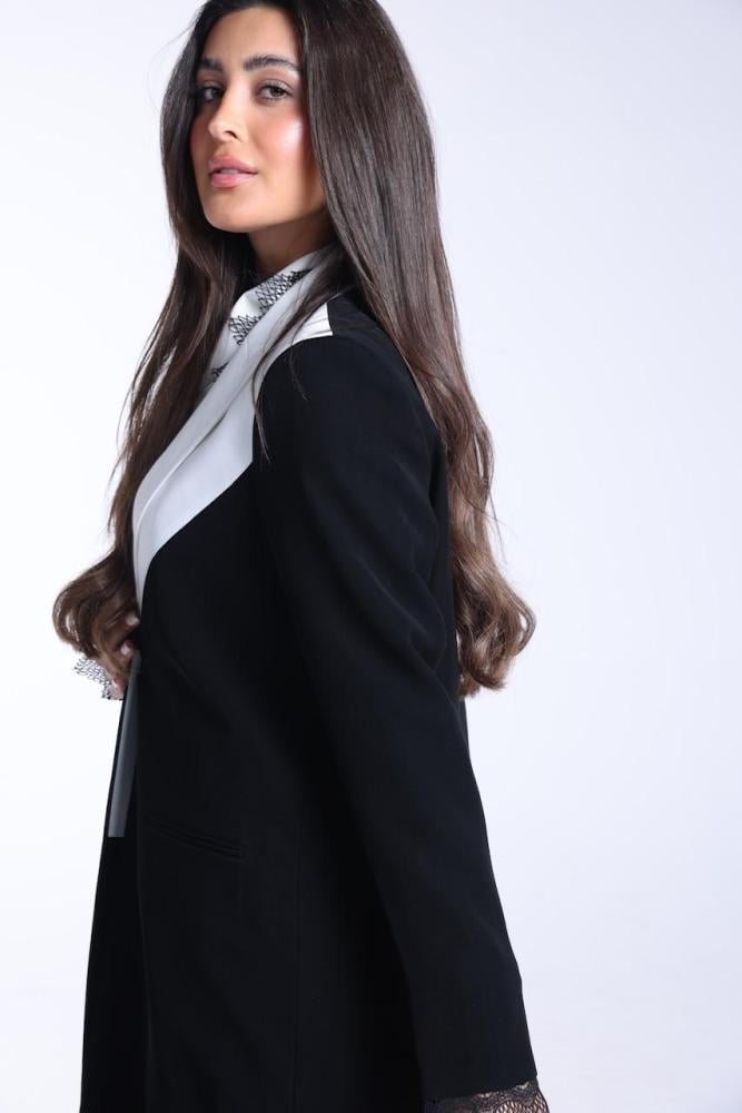 عبايه بقصة الsuit باللون الاسود الفاحم والاوف وايت بقماش الكريب الكوري مع دانتيل اوربي اسود مع طرحة بقماش الشيفون الكوري بلون الاسود