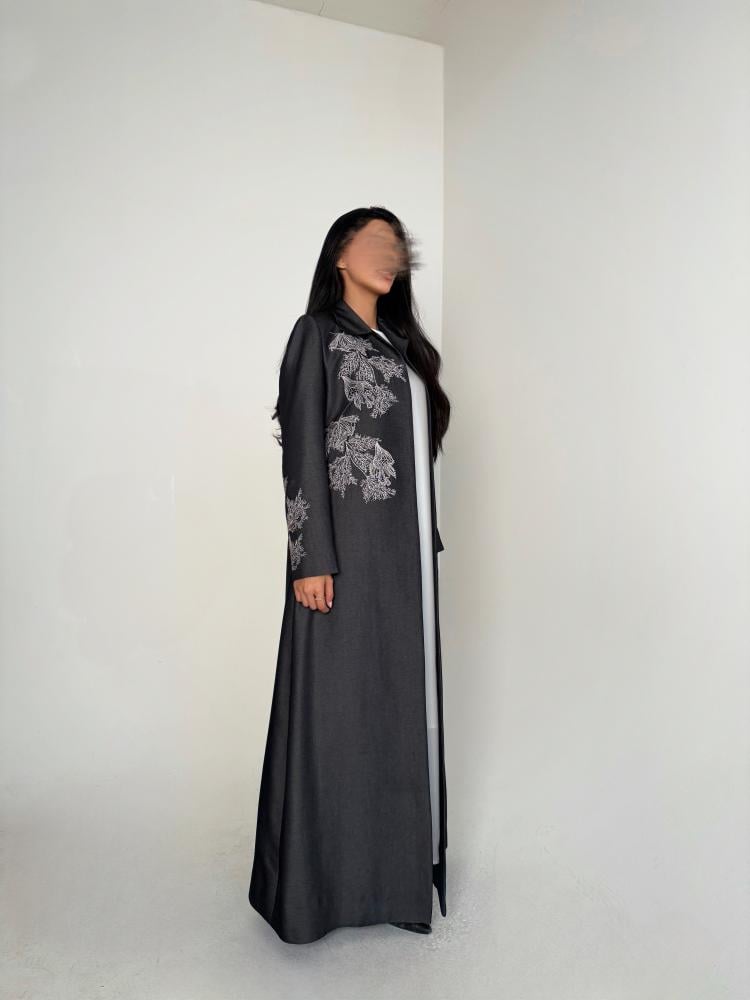 عبايه بقصة الsuit باللون الرمادي الغامق جدا بقماش الجينز الكوري بتصميم تطريز أغصان الشجر على مقدمة العبايه والأكمام مع طرحة بقماش الشيفون الكوري بلون الرمادي الغامق