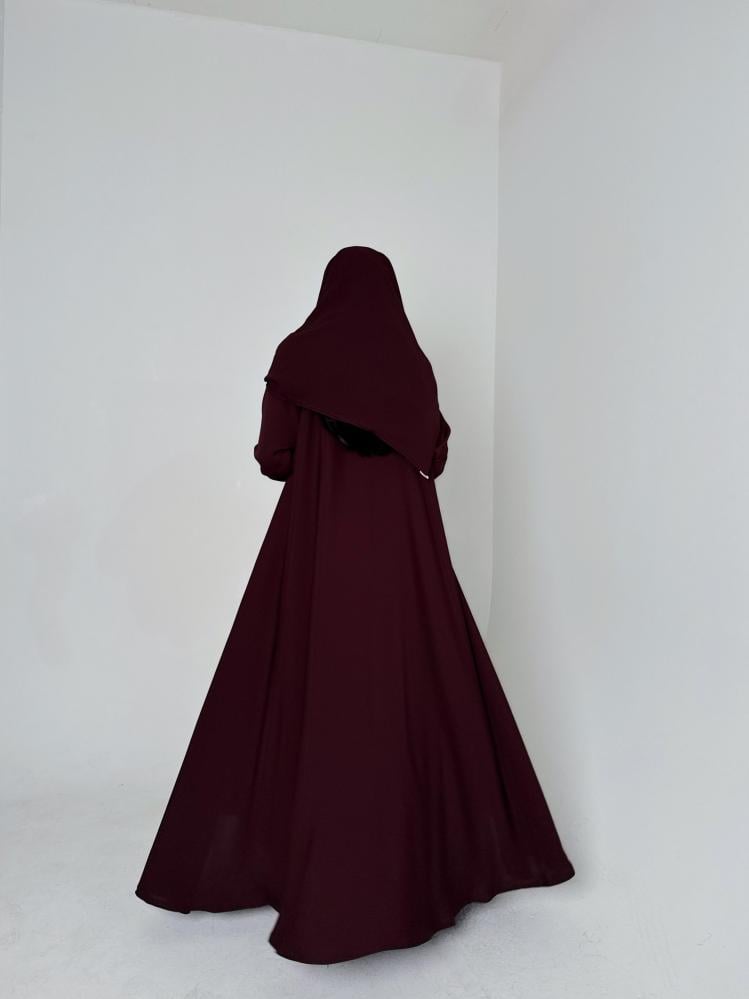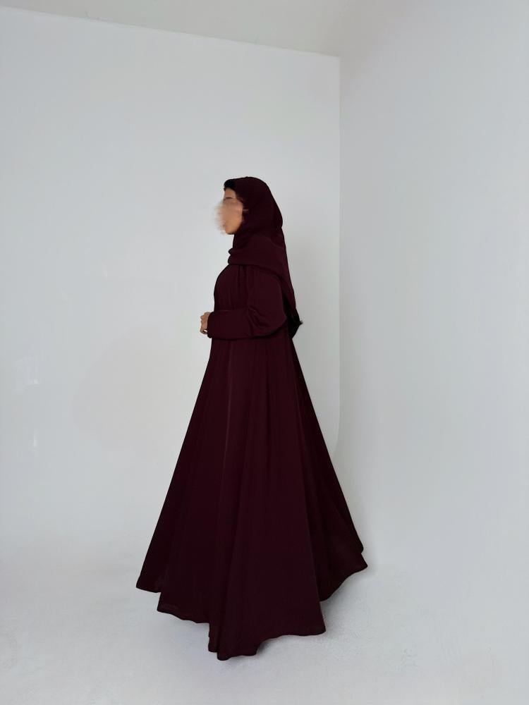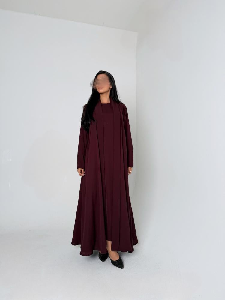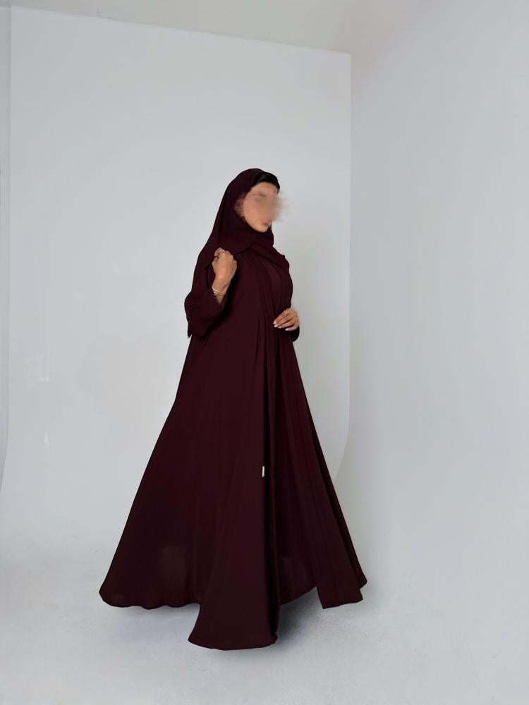 عباية دبل كلوش وفستان بقماش الكريب الياباني باللون العنابي الغامق مع طرحه من الشيفون الكوري باللون العنابي