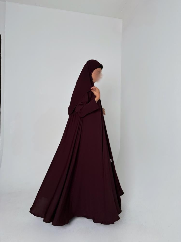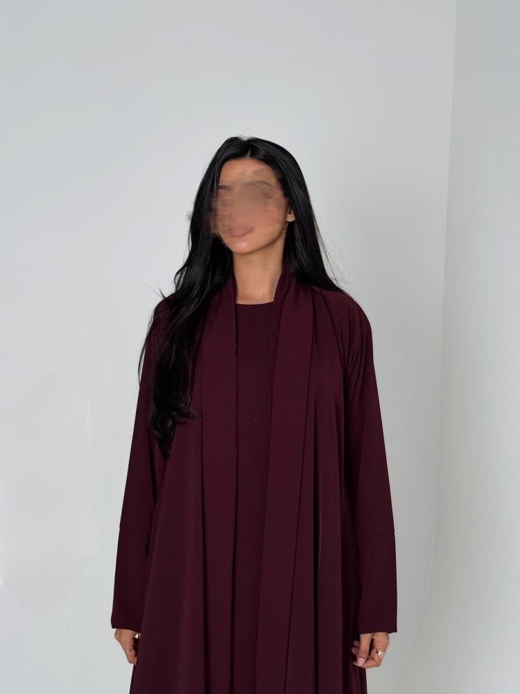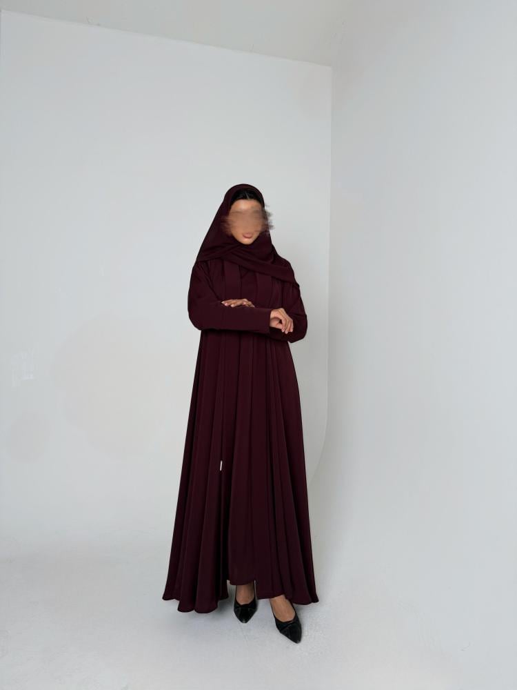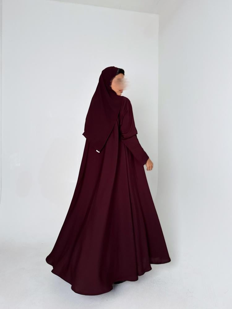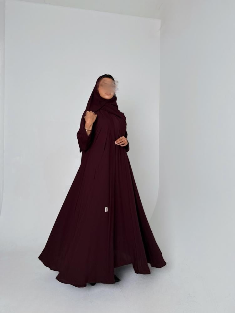 عباية دبل كلوش وفستان بقماش الكريب الياباني باللون العنابي الغامق مع طرحه من الشيفون الكوري باللون العنابي