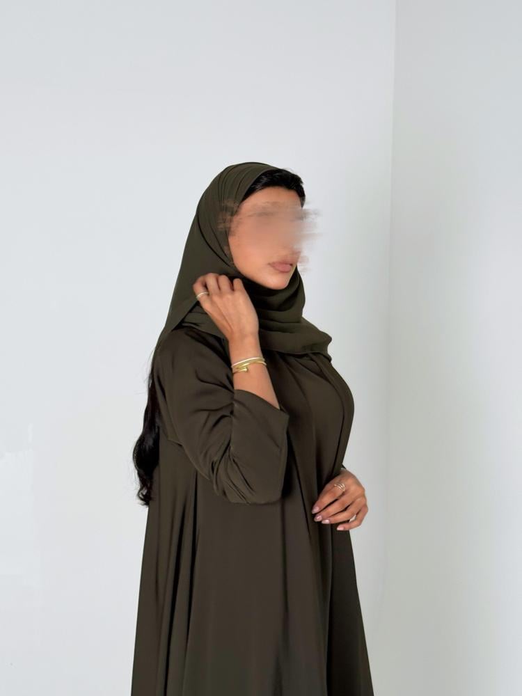 عباية دبل كلوش وفستان بقماش الكريب الياباني باللون الزيتي الغامق مع طرحه من الشيفون الكوري باللون الزيتي