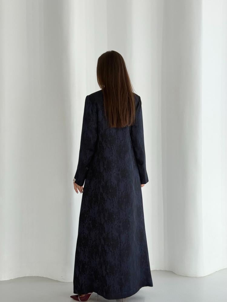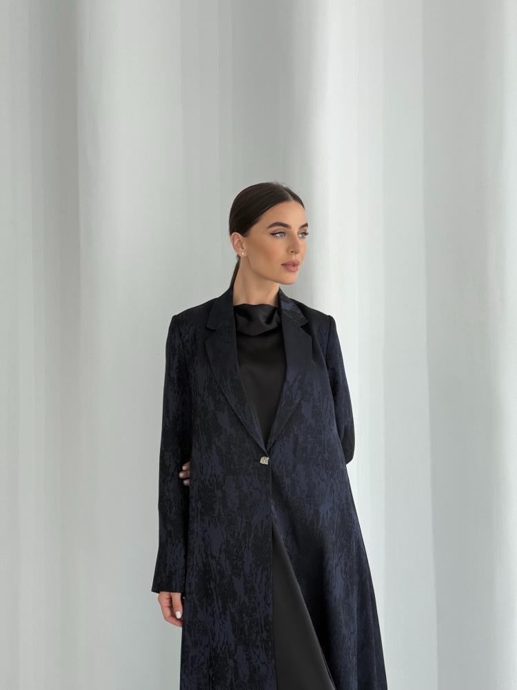 A timeless design with a modern touch, this flared-cut abaya flows with elegance and grace. Crafted from cool Japanese jacquard silk in classic navy with delicate patterns that add depth and sophistication. Paired with a navy Japanese chiffon scarf, it completes the look with refined harmony for every occasion.