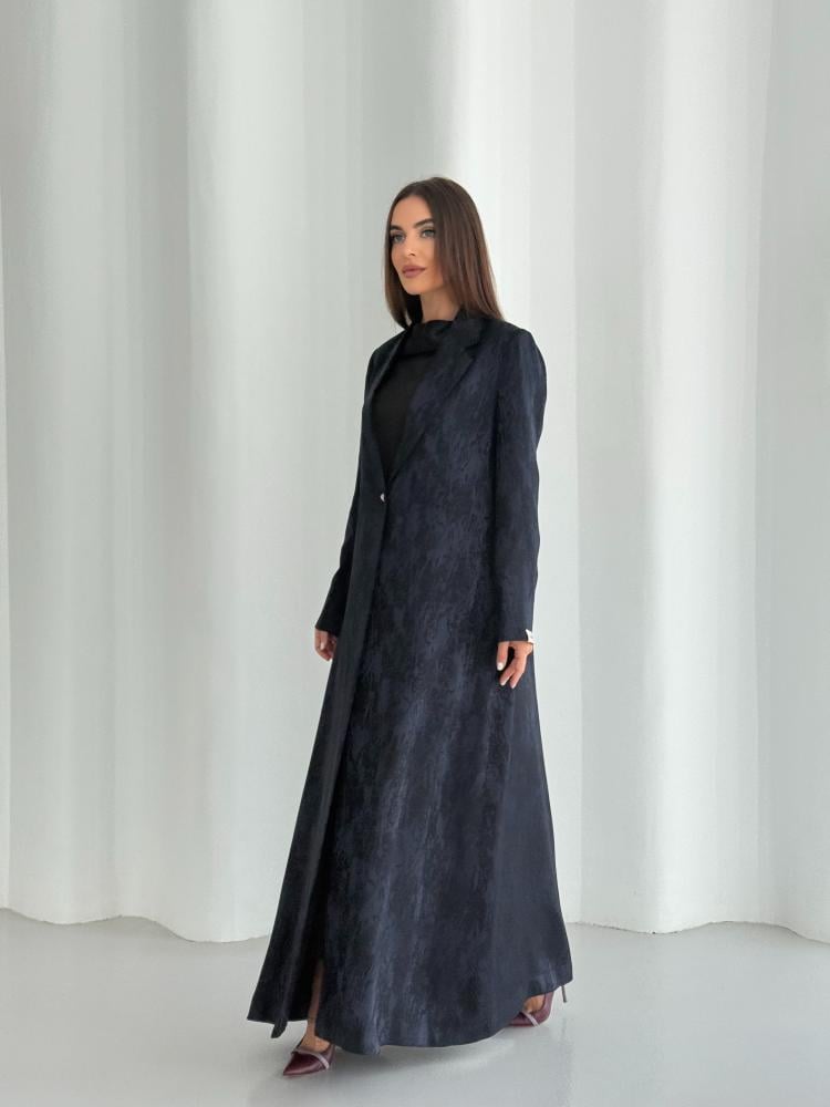 إطلالة تجمع بين الكلاسيكية والعصرية، عباية بقصة كلوش انسيابية تضيف حضوراً أنيقاً في كل مناسبة. مصنوعة من حرير جاكار ياباني بارد باللون الكحلي الغامق مع نقشة رقيقة تعكس عمقاً وفخامة للتفاصيل. مرفقة مع طرحة من الشيفون الياباني الكحلي لتكتمل الإطلالة بلمسة راقية ومتناسقة.