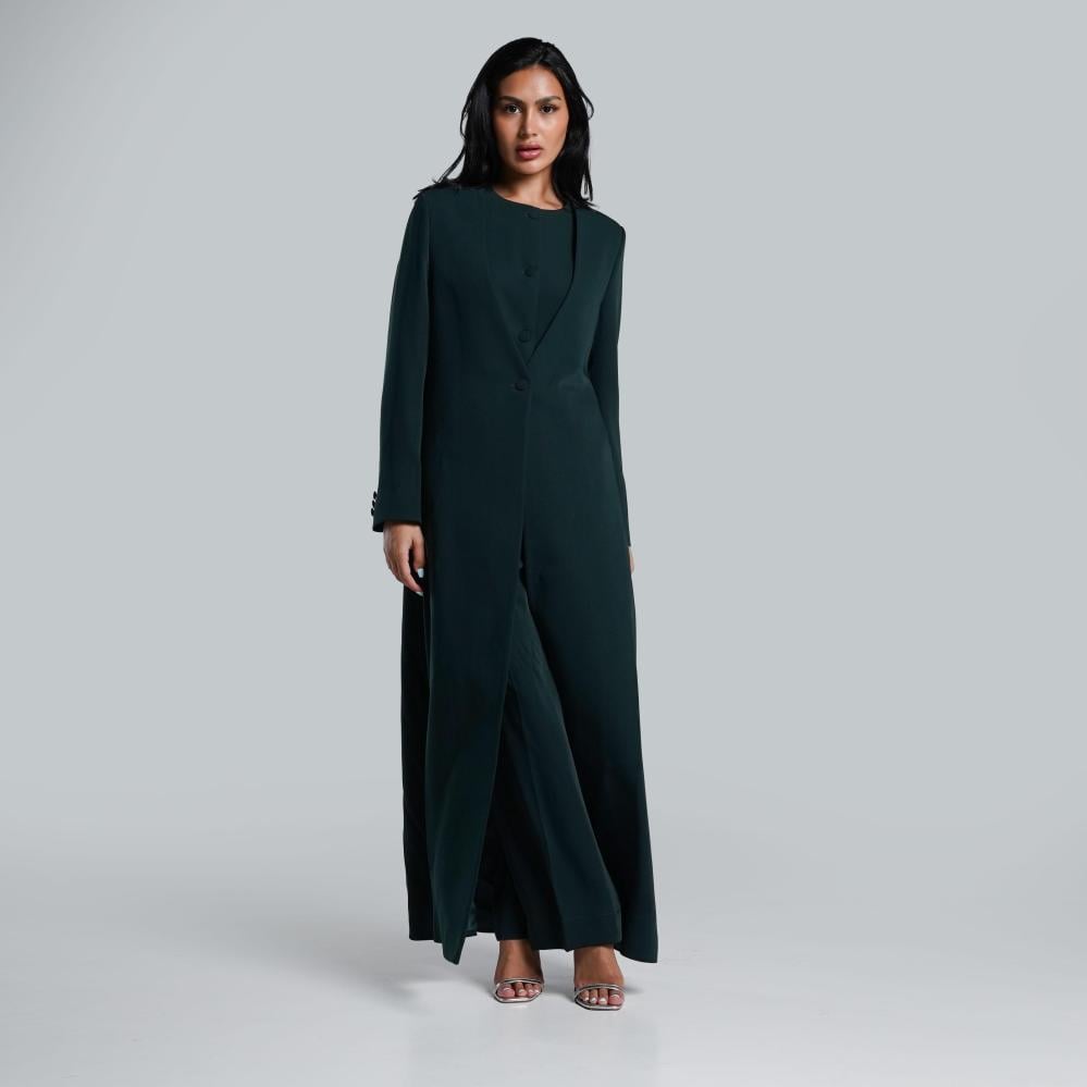 طقم مكون من عباية suitمبطنة وسديري مبطن وبنطلون بقماش الكريب الكوري باللون الزيتي مع طرحه من الشيفون الكوري باللون الزيتي