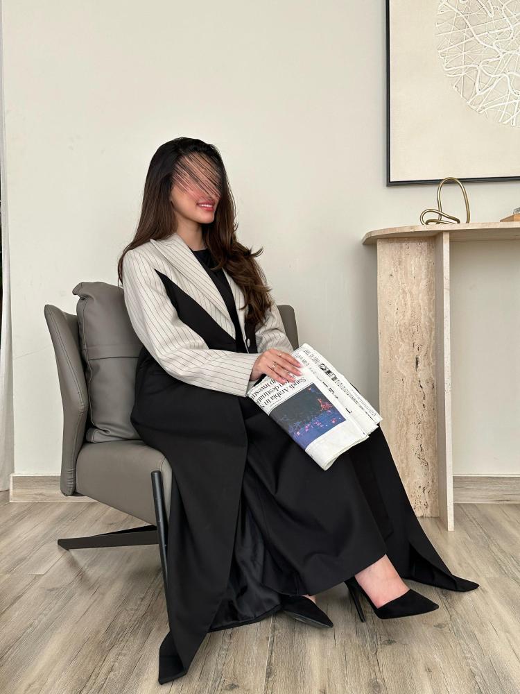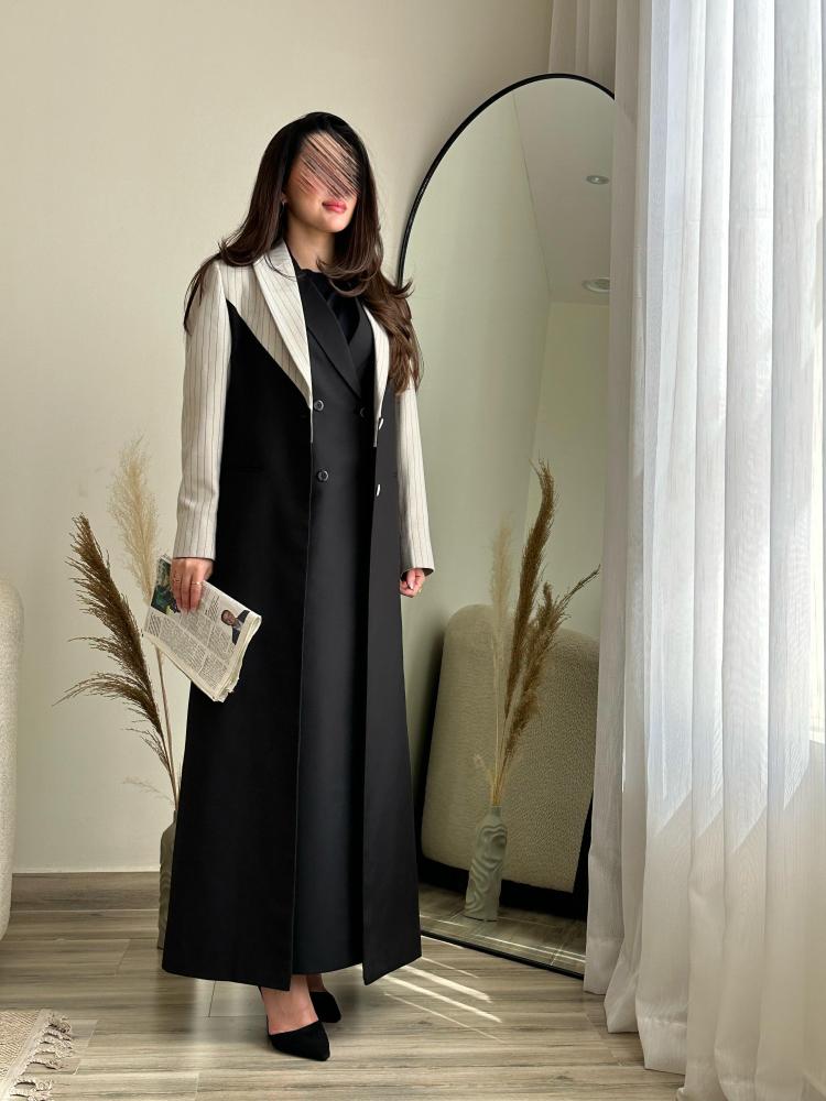عباية مبطنة suit باللون السكري والابيض بقماش جوخ الكوري مخطط بالاسود بطرحة قماش اسود الشيلة الملكية الكوري