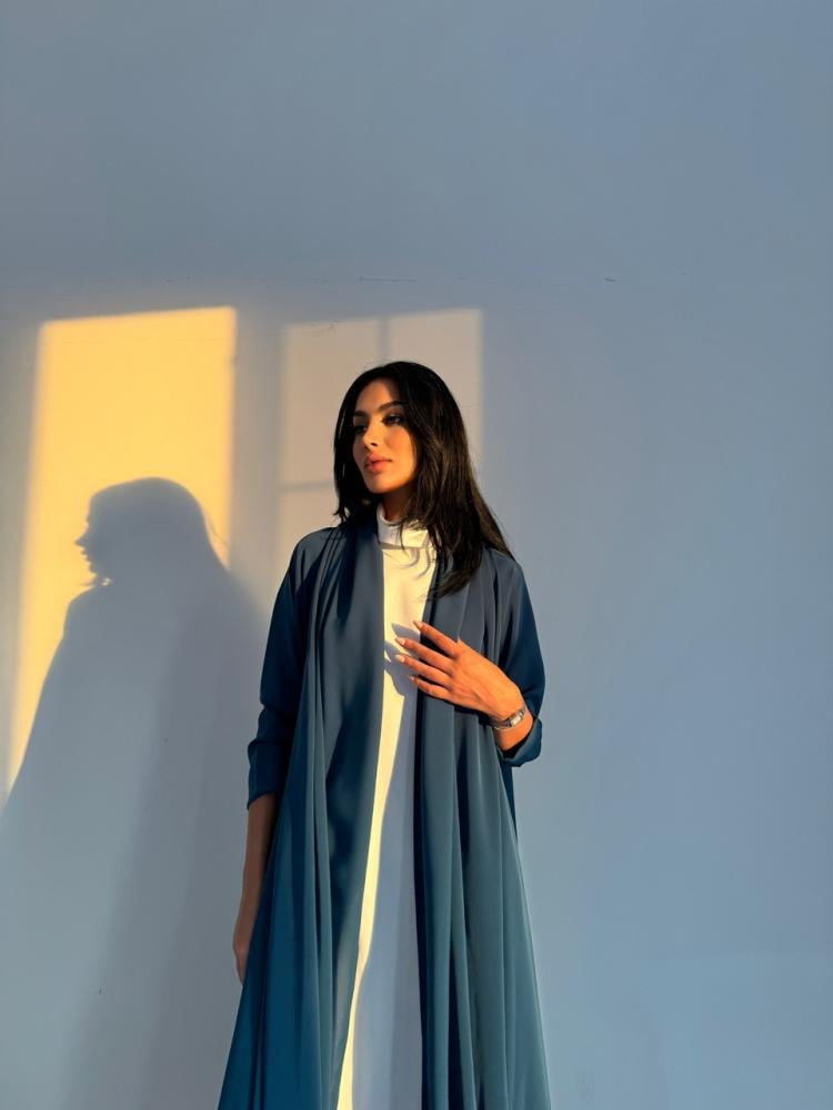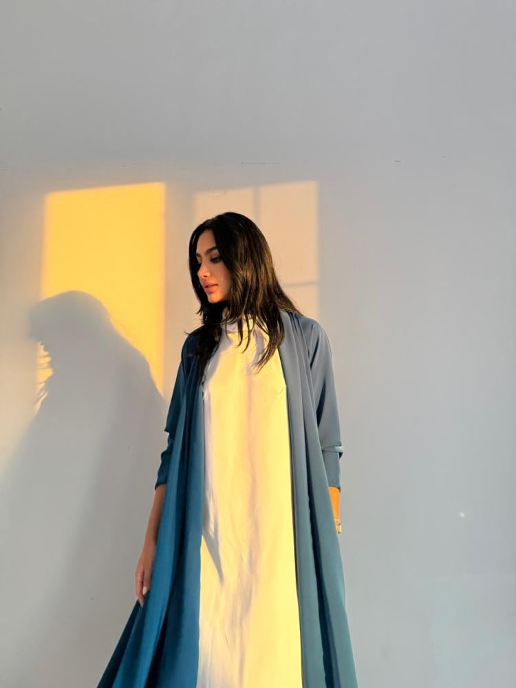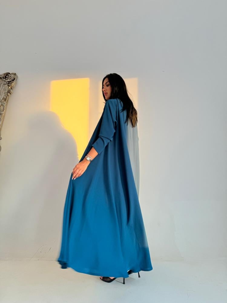 عباية دبل كلوش بكسرات من الكتف بقماش الكريب ياباني باللون البترولي اخضر مزرق وبطرحة قماش الشيفون الكوري بنفس اللون
