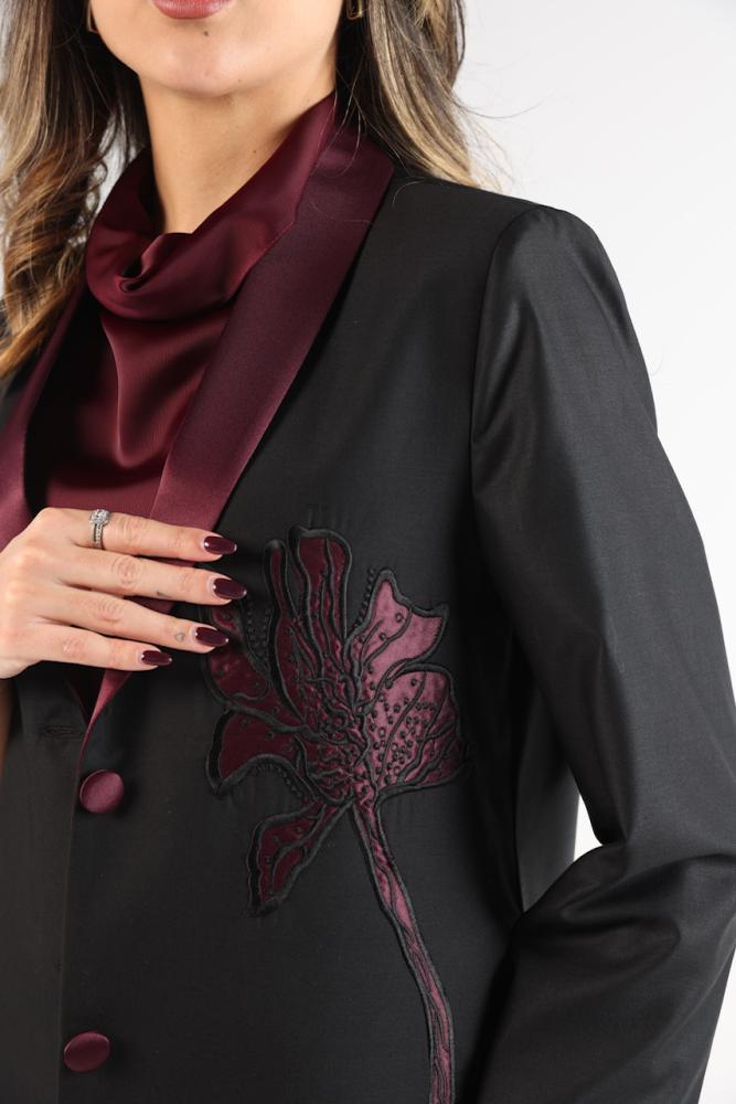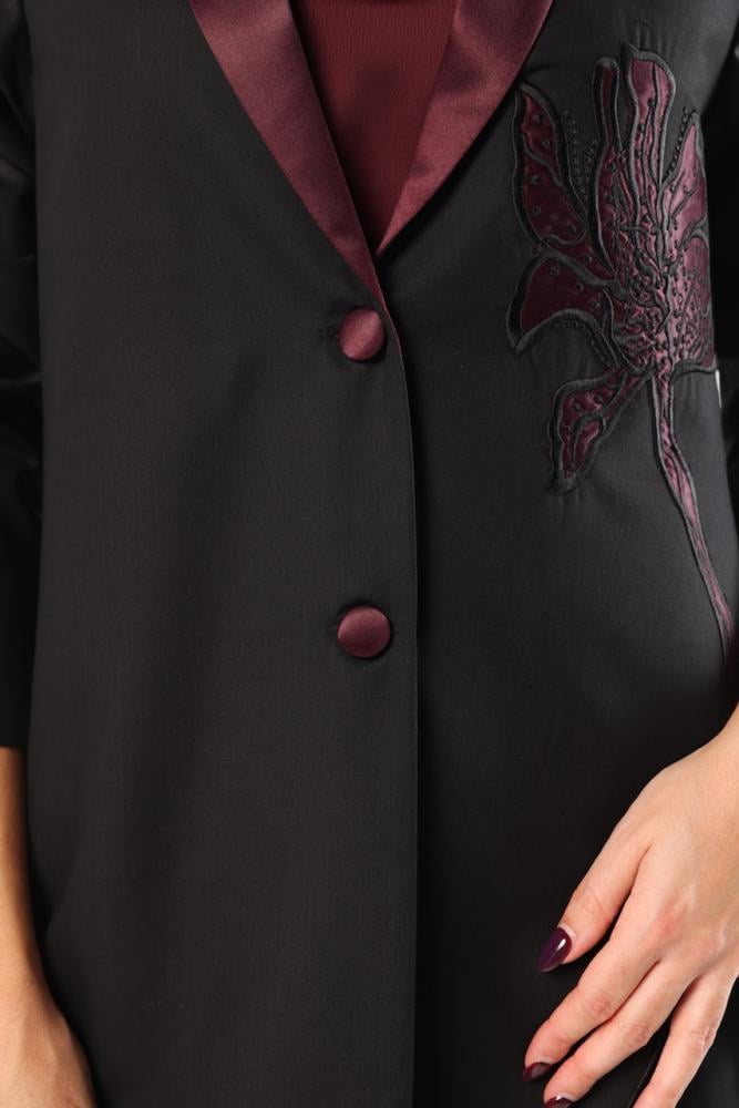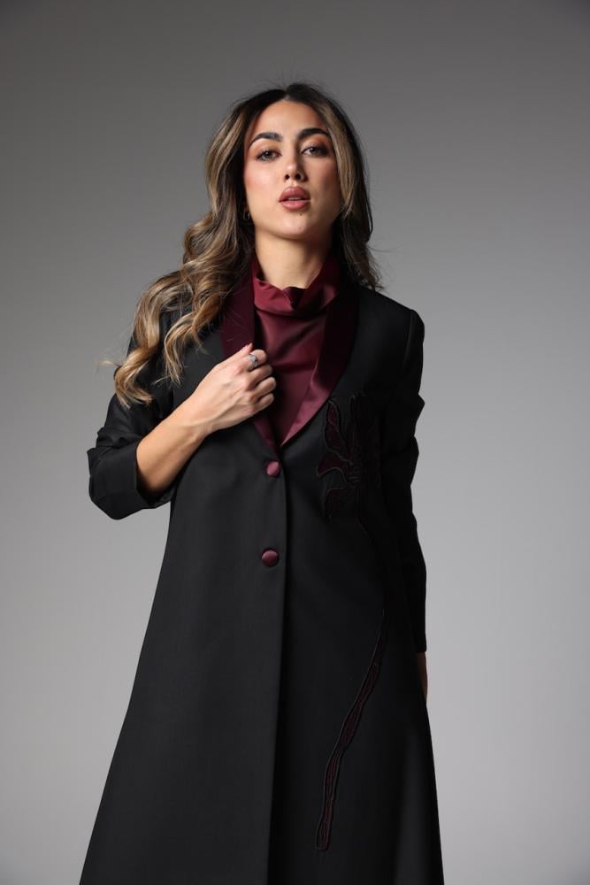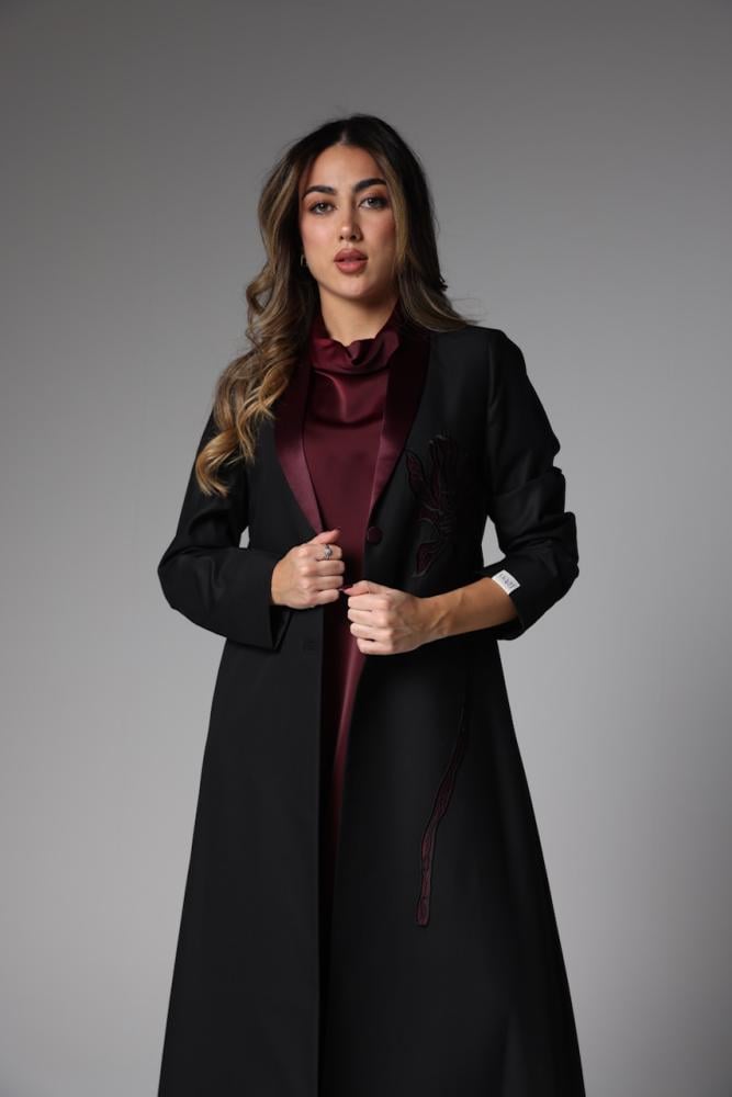 عباية suit باللون الاسود بقماش الكوري وباللون البرقندي مطرزة باللون الاسود وطرحة باللون الاسود بقماش الشيفون الكوري