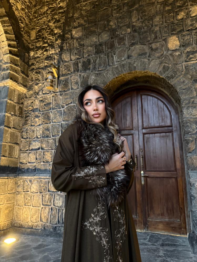 عباية كلوش باللون الزيتي بقماش الجوخ الكوري مع فرو ثعلب طبيعي وطرحة باللون الزيتي بقماش الشيفون الكوري