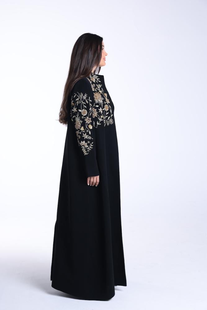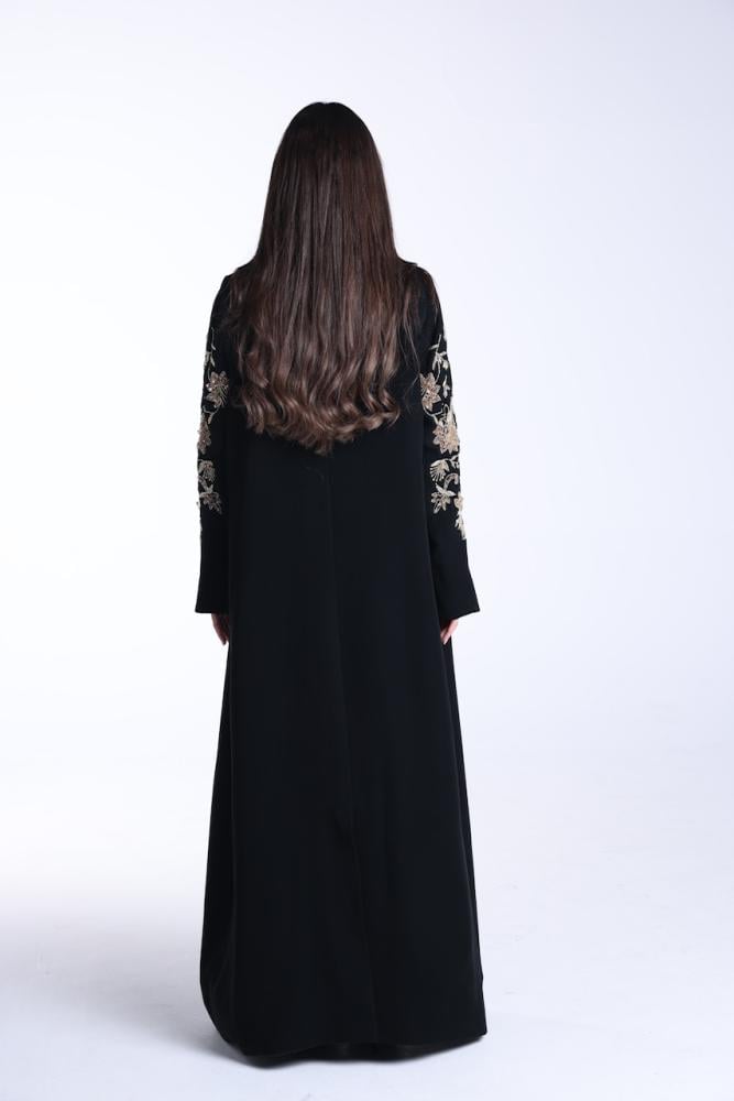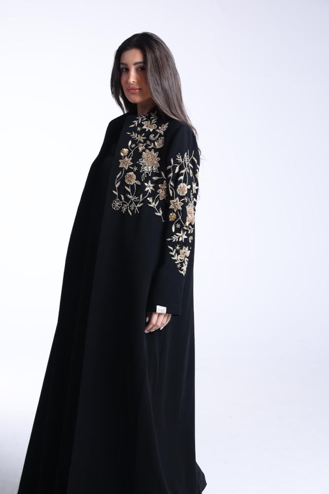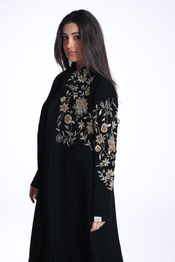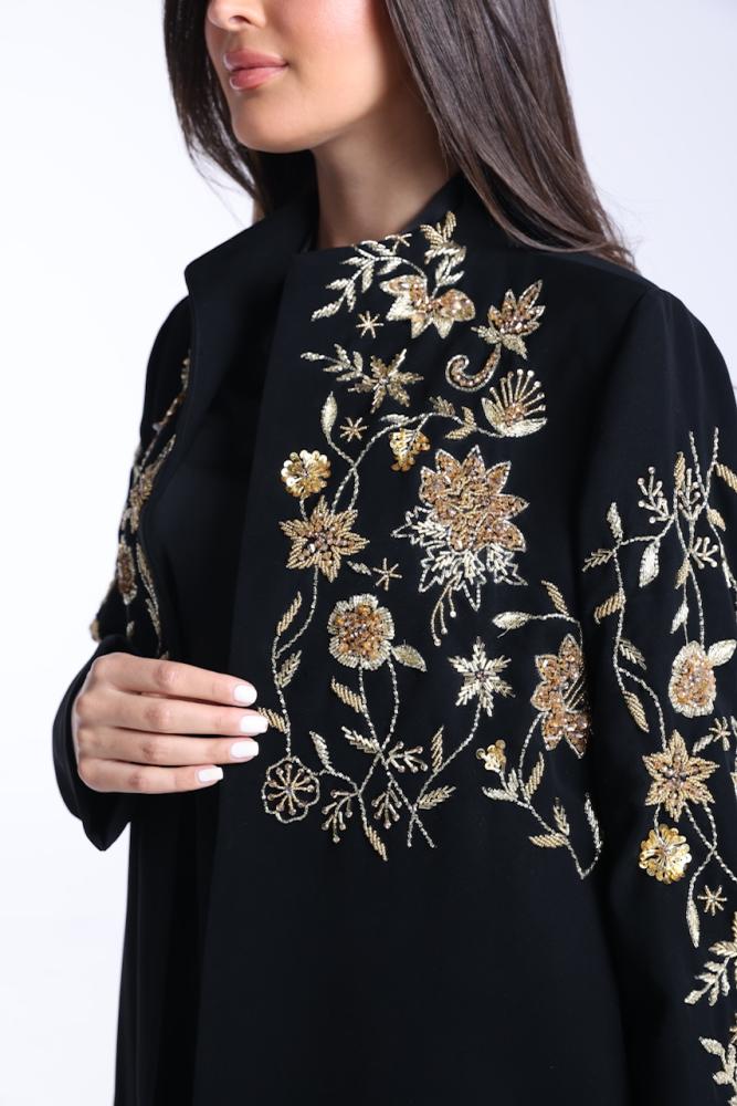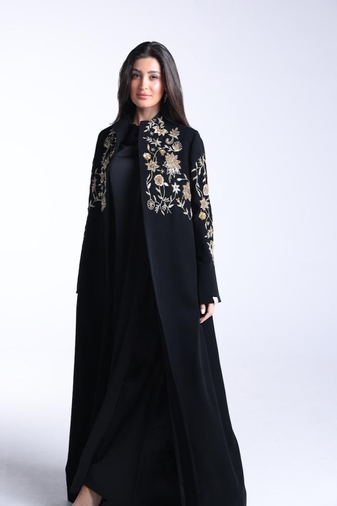 عبايه بقصة الsuit باللون الاسود الفاحم بقماش الكريب الكوري بتصميم شك ذهبي مع طرحة بقماش الشيفون الكوري بلون الاسود مع شك بطرفها