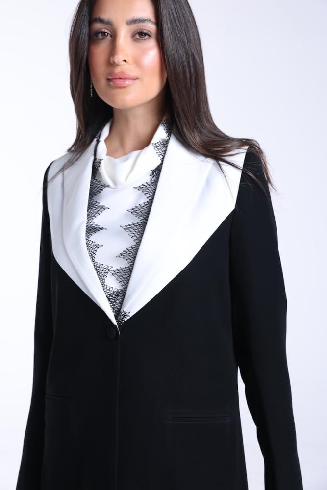 عبايه بقصة الsuit باللون الاسود الفاحم والاوف وايت بقماش الكريب الكوري مع دانتيل اوربي اسود مع طرحة بقماش الشيفون الكوري بلون الاسود