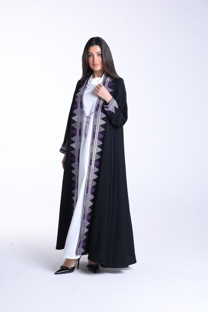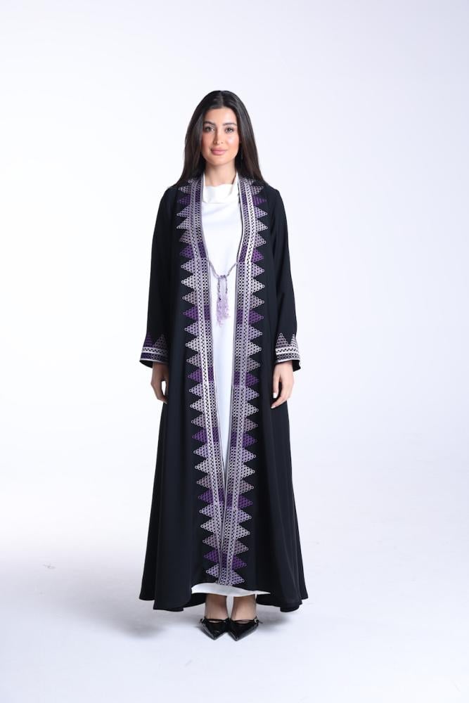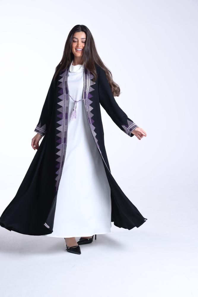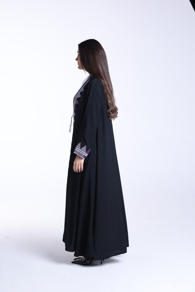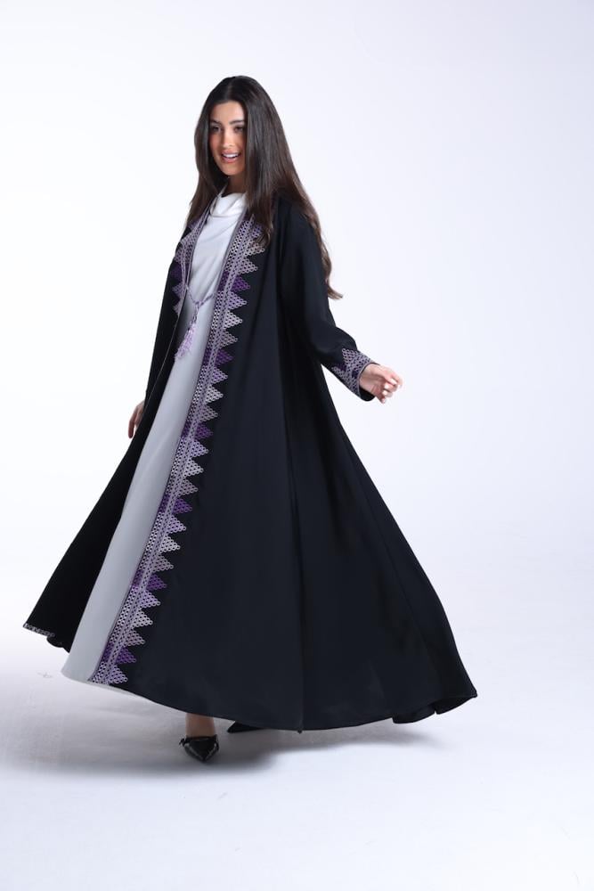 عباية بقصة كلوش بقماش الكريب الياباني باللون الاسود بتطريز السدو بتدرجات البنفسجي مع طرحة بقماش الشيفون الكوري باللون الاسود بتصميم تطريز نفس العباية