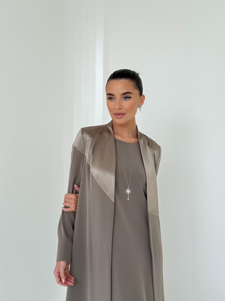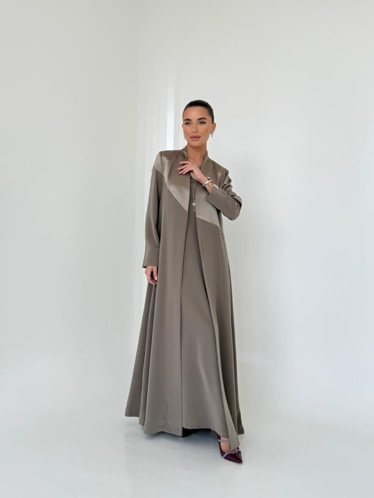 An elegant abaya crafted from premium Japanese Salona fabric with dual textures — matte and shiny — in a sophisticated taupe shade. The design features a distinctive line blending both sides of the fabric, creating a refined contrast. Cut in a flowy cloche style that is lightweight, breathable, and effortlessly chic. Completed with a matching Japanese chiffon scarf in the same tone for a perfectly polished look.