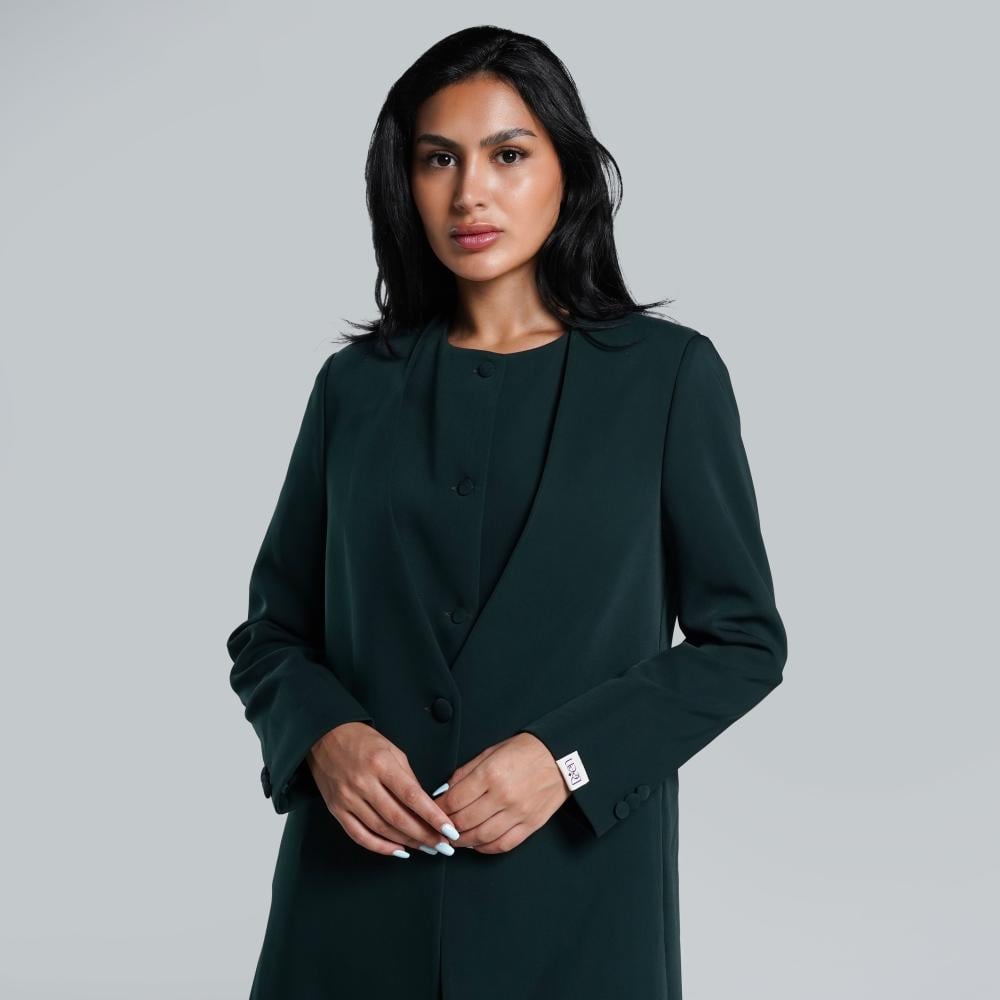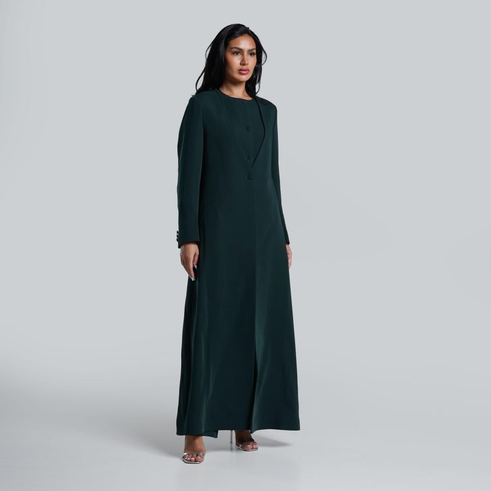 طقم مكون من عباية suitمبطنة وسديري مبطن وبنطلون بقماش الكريب الكوري باللون الزيتي مع طرحه من الشيفون الكوري باللون الزيتي