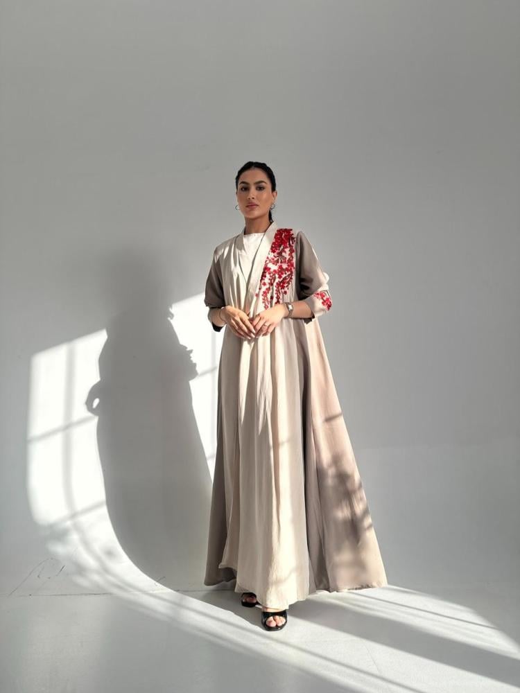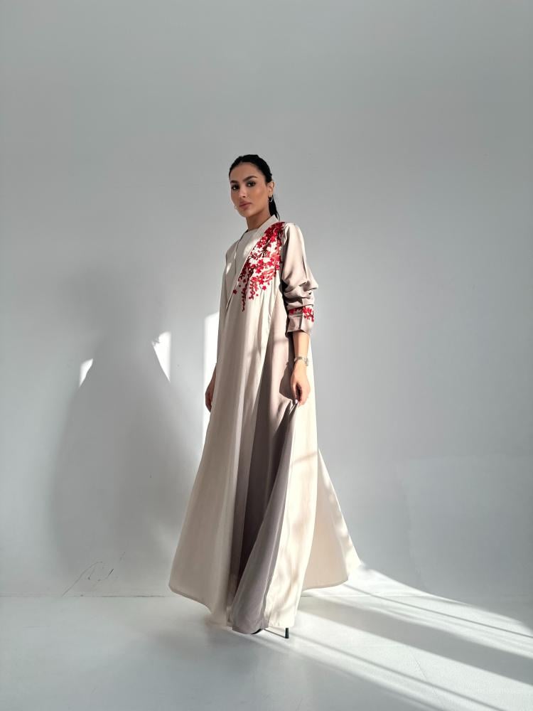 عباية كلوش بقماش اللنين المغسول الياباني بتطريز غصن الاحمر باللون البيج والبني فاتح وبطرحة قماش الشيفون الكوري باللون البيج مطرزة