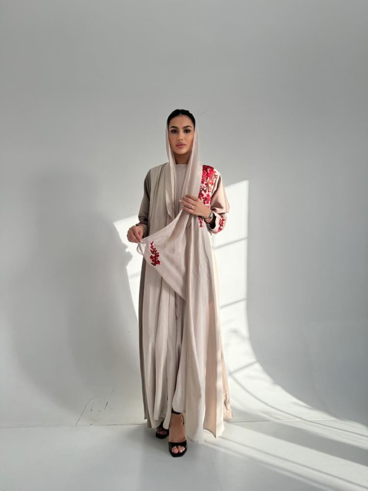 عباية كلوش بقماش اللنين المغسول الياباني بتطريز غصن الاحمر باللون البيج والبني فاتح وبطرحة قماش الشيفون الكوري باللون البيج مطرزة